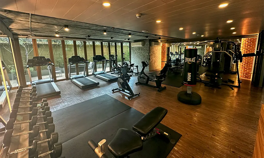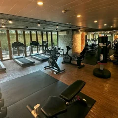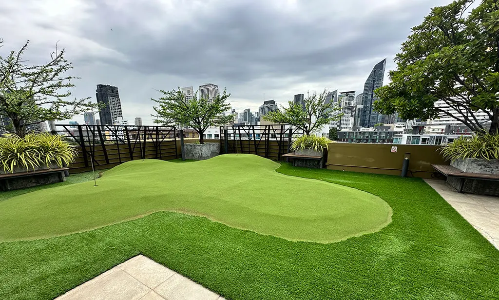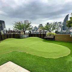 小さめのプール、24時間利用可能なフィットネス、パターゴルフ、水着着用ですが、露天風呂風のジャグジーも付いています。